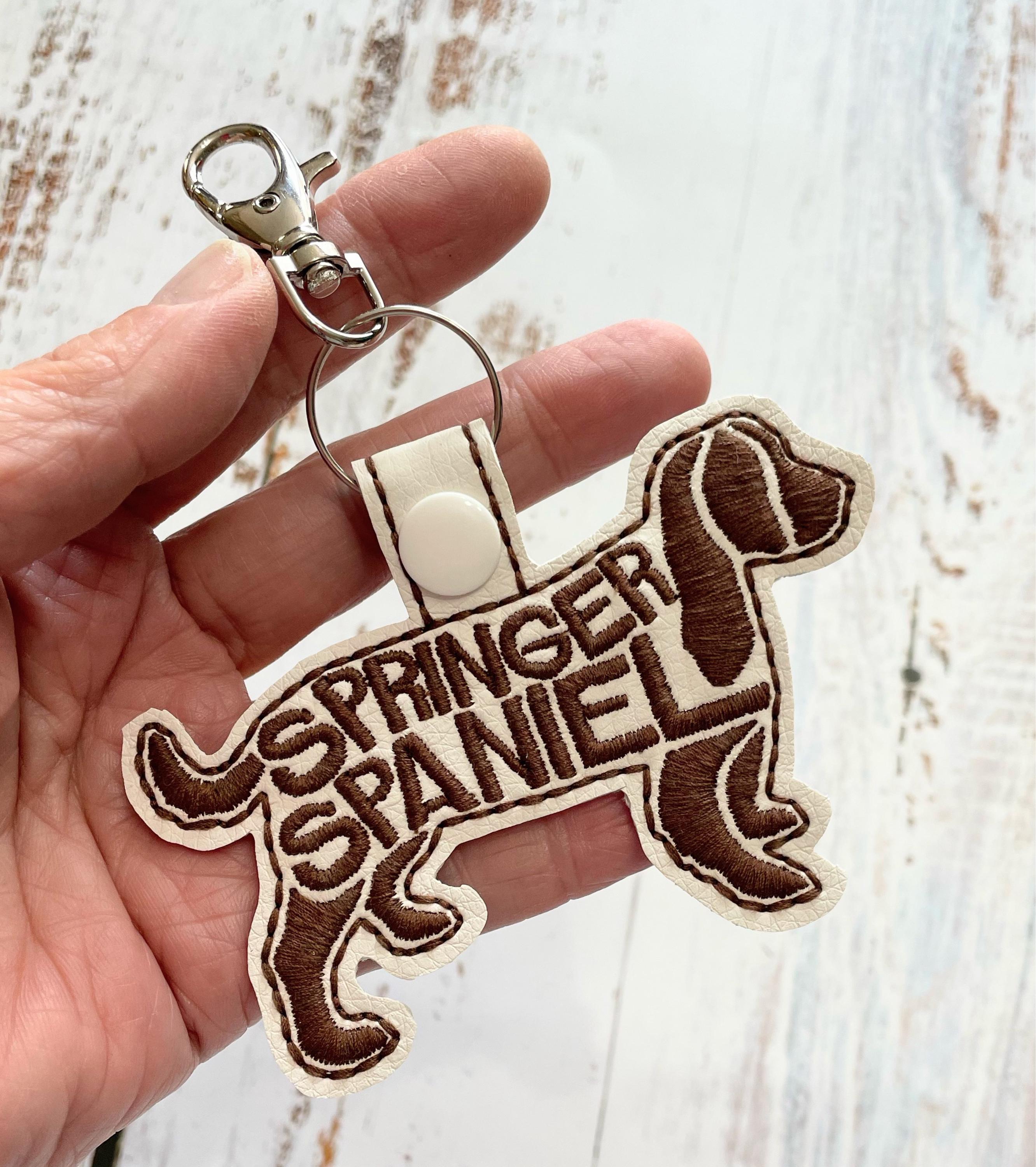 This Springer Spanie Text Fill Keychain 4 x 4 snap tab key fob embroidery design can be made using various materials such as: felt, vinyl, mirror canvas, leather, reinforced cotton, etc. on your embroidery machine. Snap tab/key fobs can be used as key chains, tags for your purse, charms for your children's backpack or even a zipper pull for their coat. It is a fun enhancement to a mobile phone or as an accessory for your daily planner. The ideas are endless. Snap tabs are perfect gifts for anyone, they have quickly become the best party favors. This a great item for your craft shows, vendor events and festivals. Kids love to collect them to decorate their backpacks and gym bags as a way to express themselves and show their interests.