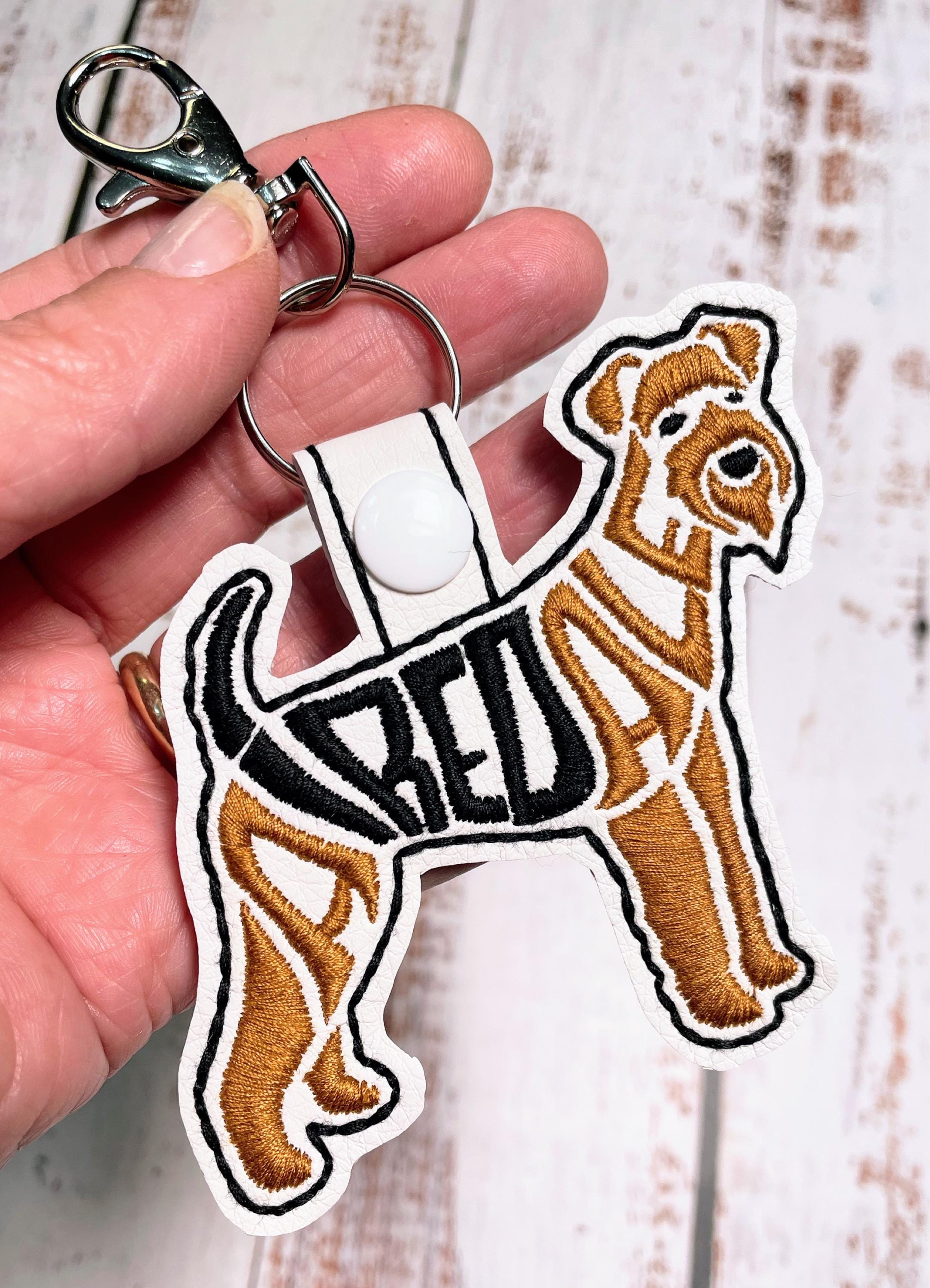 This AiredaleText Fill Keychain 4 x 4 snap tab key fob embroidery design can be made using various materials such as: felt, vinyl, mirror canvas, leather, reinforced cotton, etc. on your embroidery machine. Snap tab/key fobs can be used as key chains, tags for your purse, charms for your children's backpack or even a zipper pull for their coat. It is a fun enhancement to a mobile phone or as an accessory for your daily planner. The ideas are endless. Snap tabs are perfect gifts for anyone, they have quickly become the best party favors. This a great item for your craft shows, vendor events and festivals. Kids love to collect them to decorate their backpacks and gym bags as a way to express themselves and show their interests.