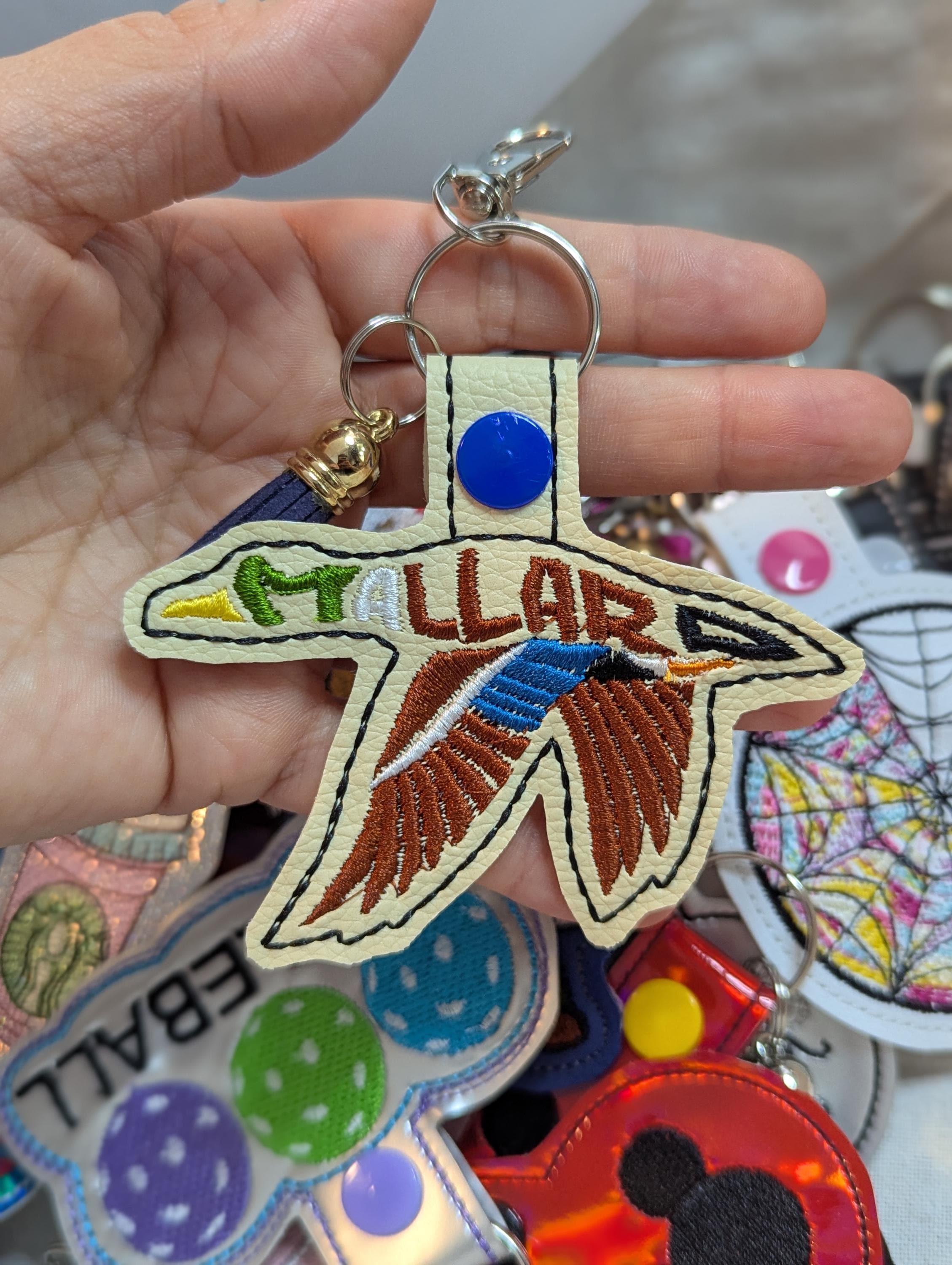 This Mallard Duck 4 x 4 Keychain snap tab key fob embroidery design can be made using various materials such as: felt, vinyl, mirror canvas, leather, reinforced cotton, etc. on your embroidery machine. Snap tab/key fobs can be used as key chains, tags for your purse, charms for your children's backpack or even a zipper pull for their coat. It is a fun enhancement to a mobile phone or as an accessory for your daily planner. The ideas are endless. Snap tabs are perfect gifts for anyone, they have quickly become the best party favors. This a great item for your craft shows, vendor events and festivals. Kids love to collect them to decorate their backpacks and gym bags as a way to express themselves and show their interests.